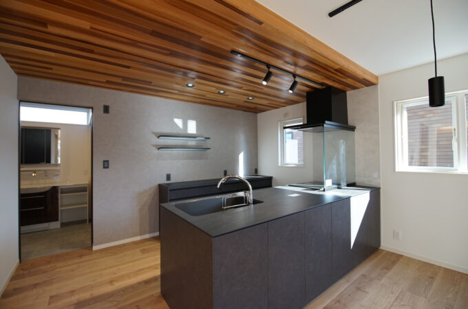 外観や内装にダーク系の色を取り入れた、こだわりの戸建て住宅が完成いたしました。 玄関正面のアクセントクロスは濃い目のグ...