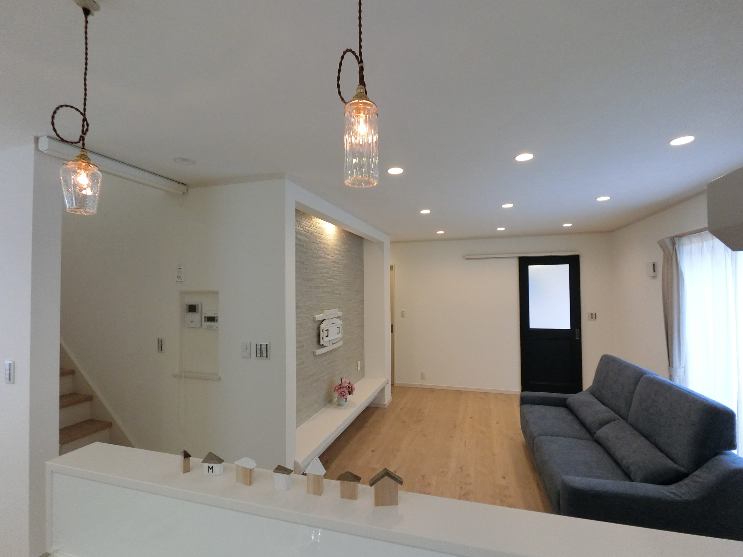 お客様の目線にも気を配った素敵なリビング。階段は半オープンです。