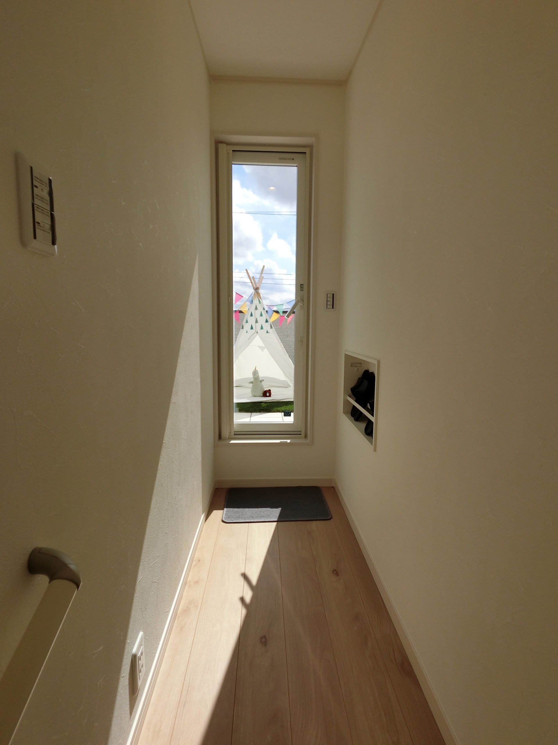 このPHは面積の規定が厳しく、あまりスペースが取れないのですが、壁厚を利用したスリッパラックでひと工夫。