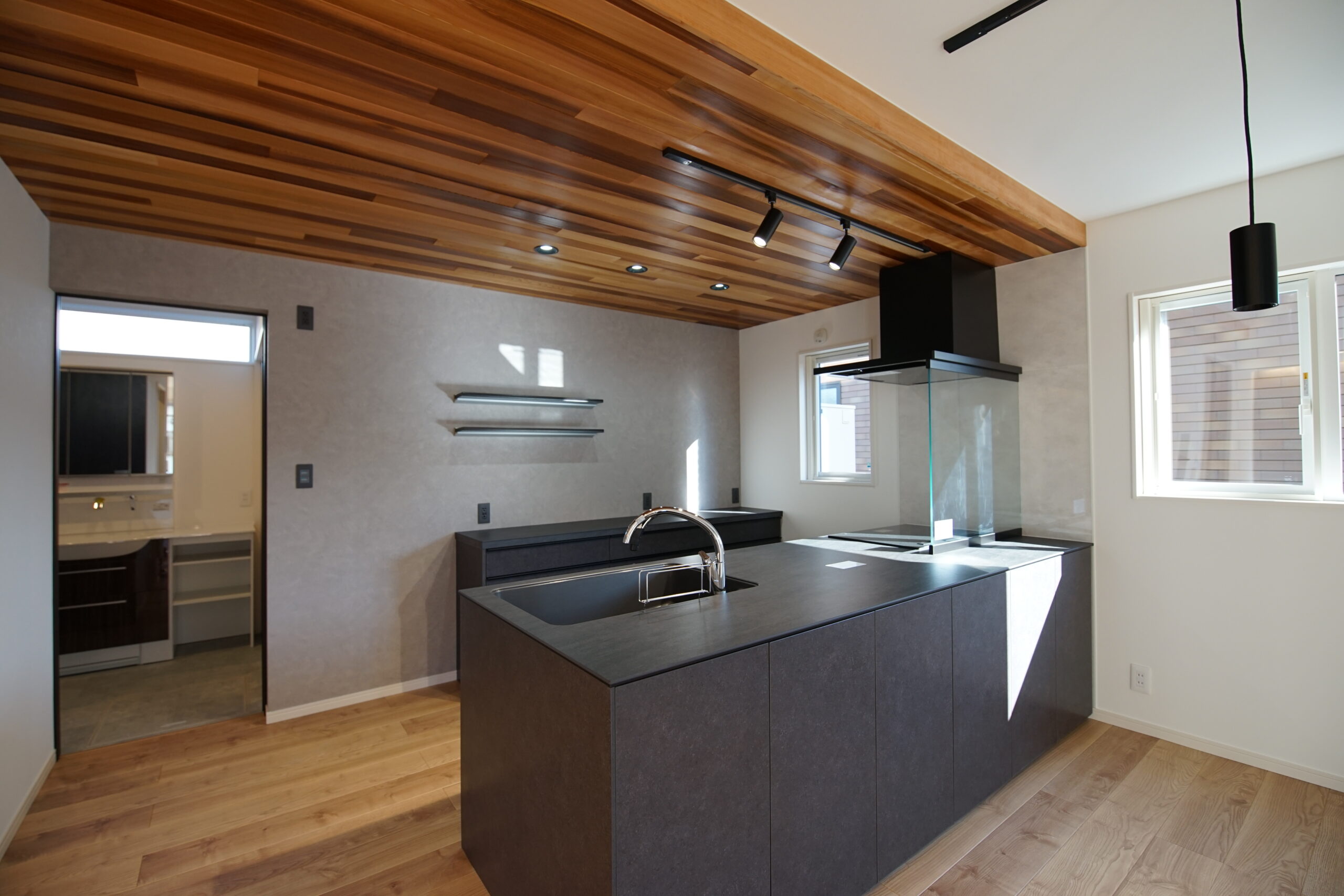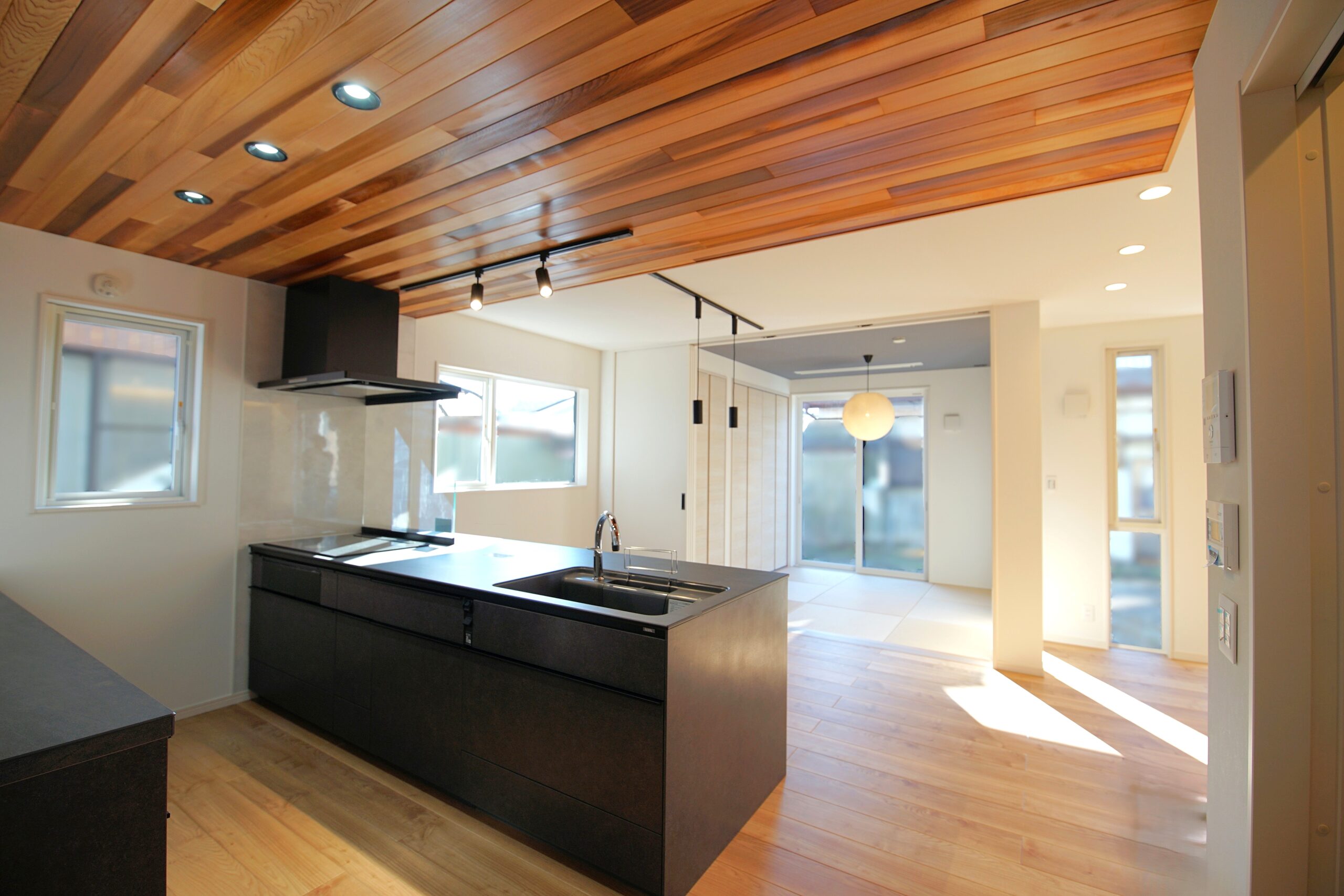 天井にはウッドパネルを使用し、木の暖かみや質感が感じられるキッチンとなりました。