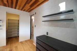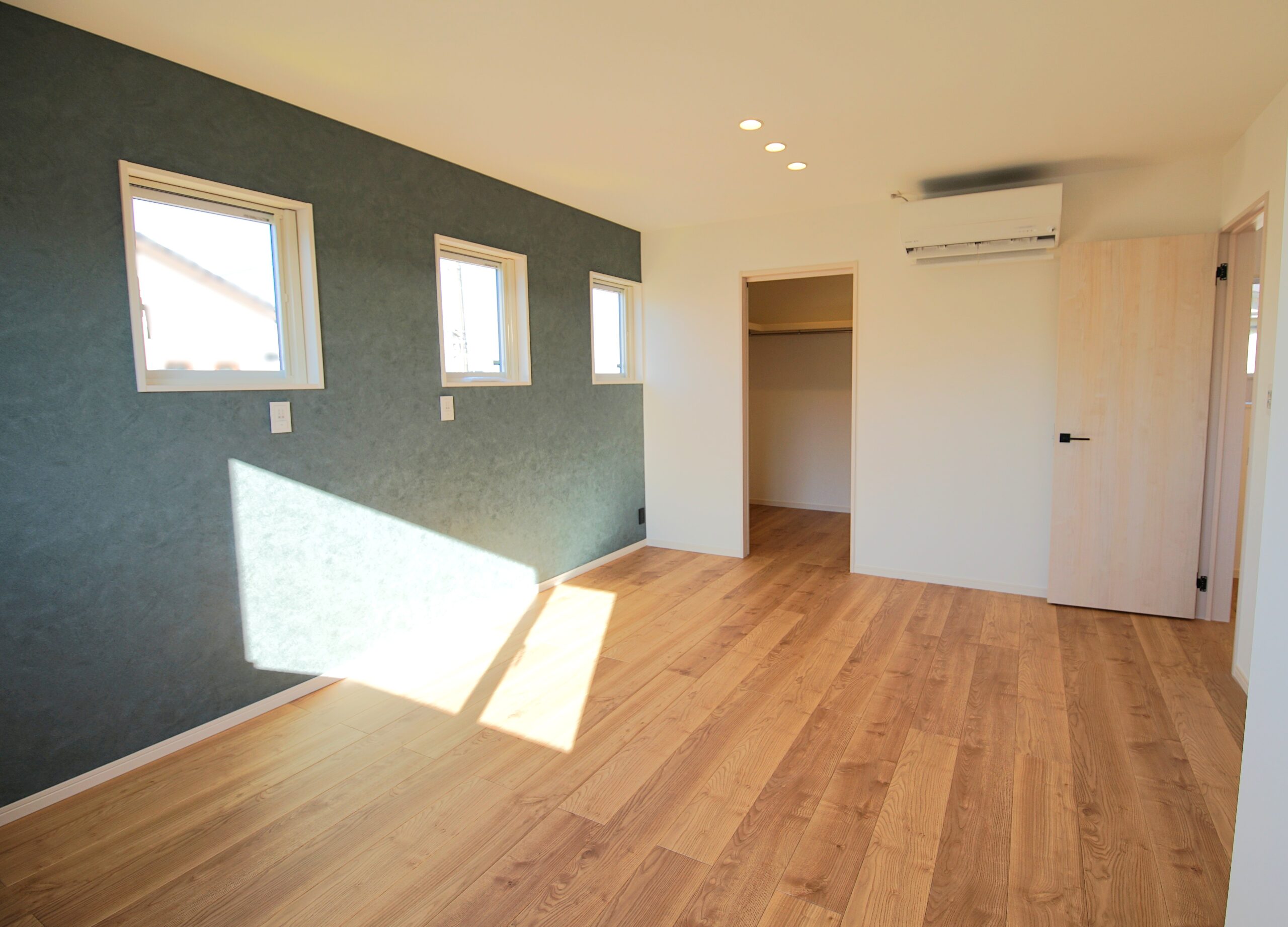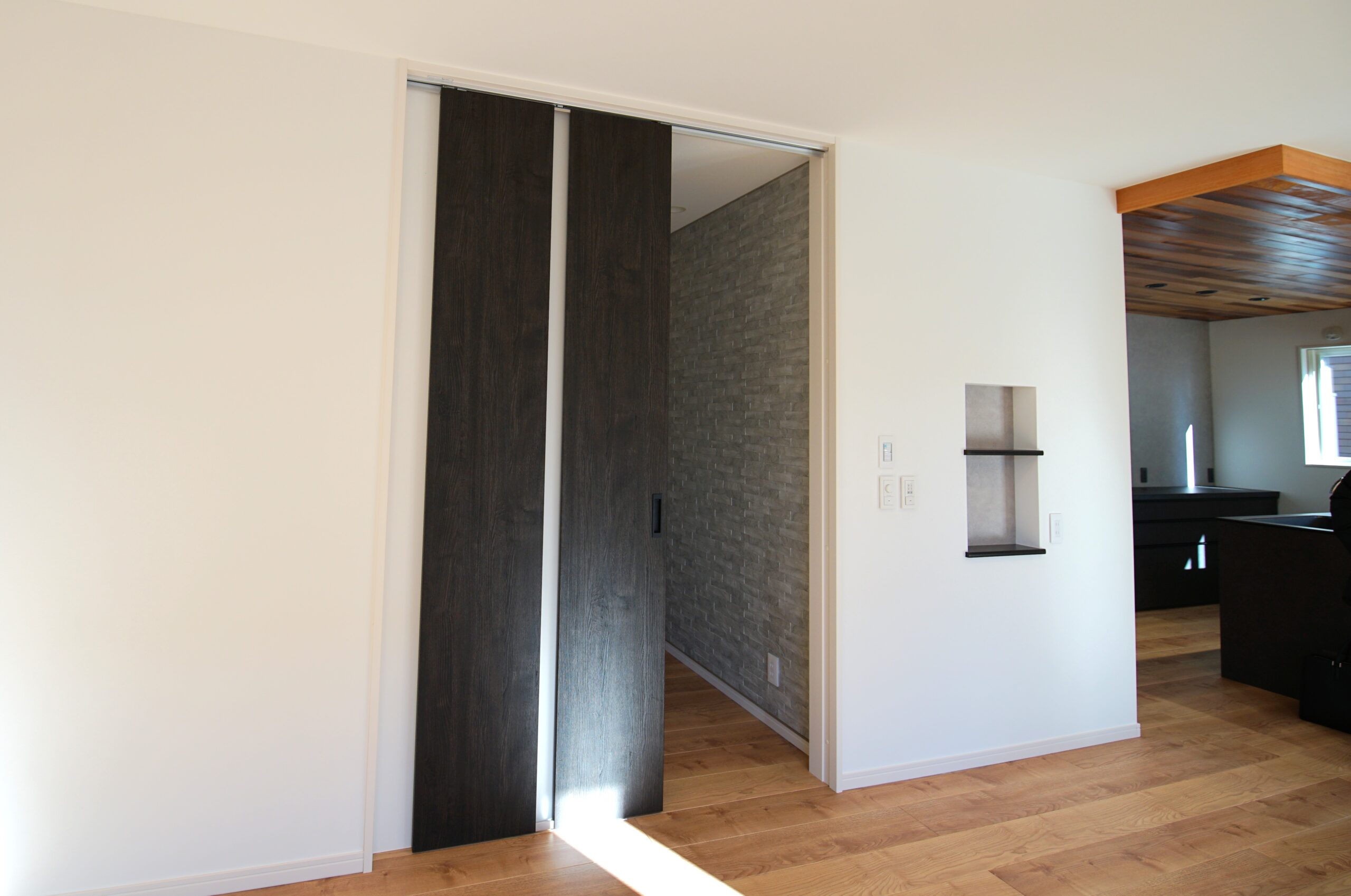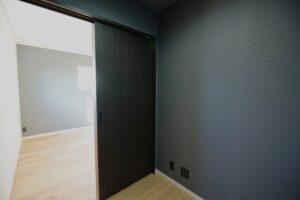 2階の寝室には書斎を設け、クロス・扉・コンセントはダーク系の色でまとめています。
