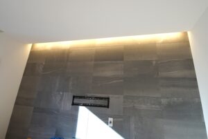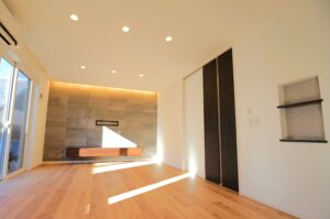 テレビ背面のアクセント壁は、湿度調整や脱臭効果のある「エコカラット」を使用しています。