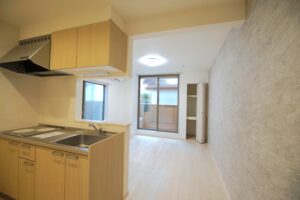 お部屋の壁や床は、清潔感のある白系の色をベースとし、リビングにはアクセントクロスを使用し、号室ごとに異なる柄を使用しています。