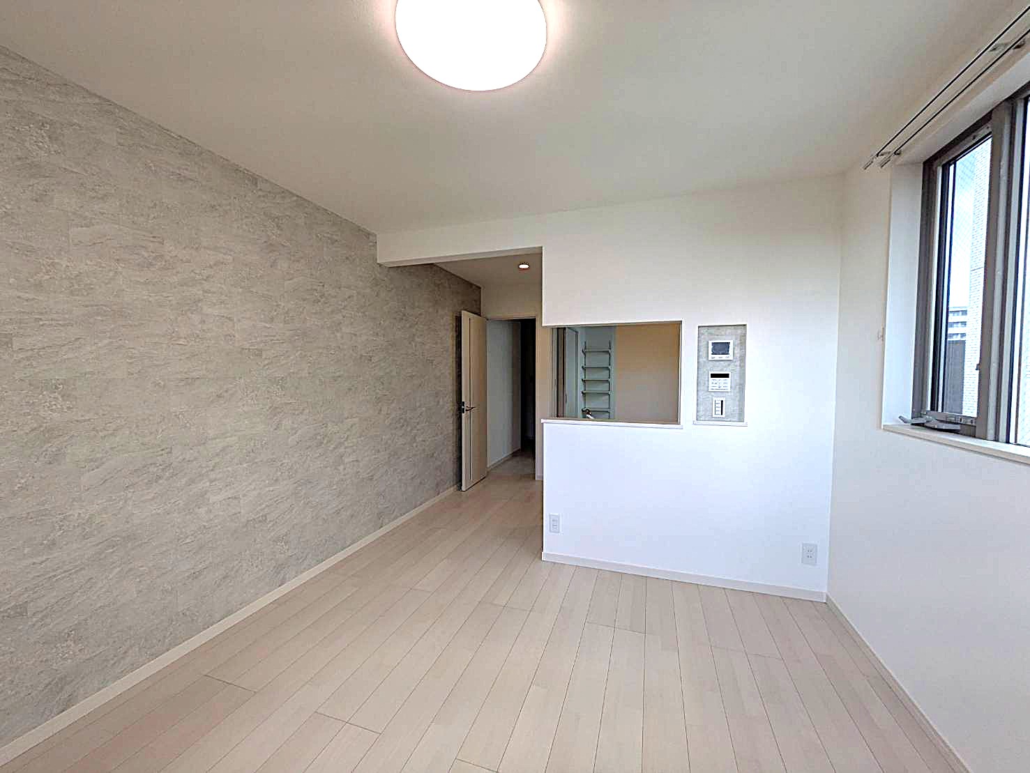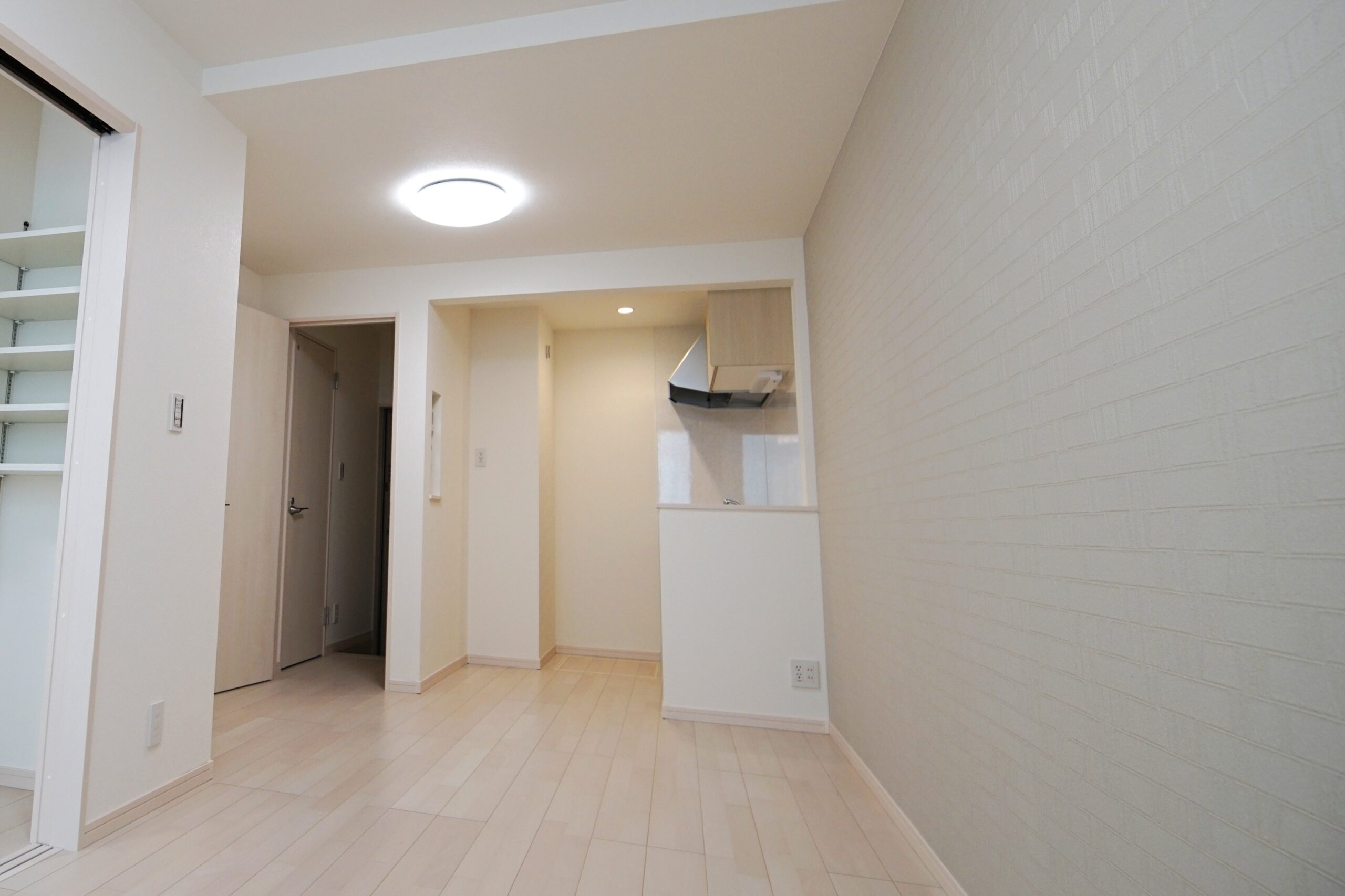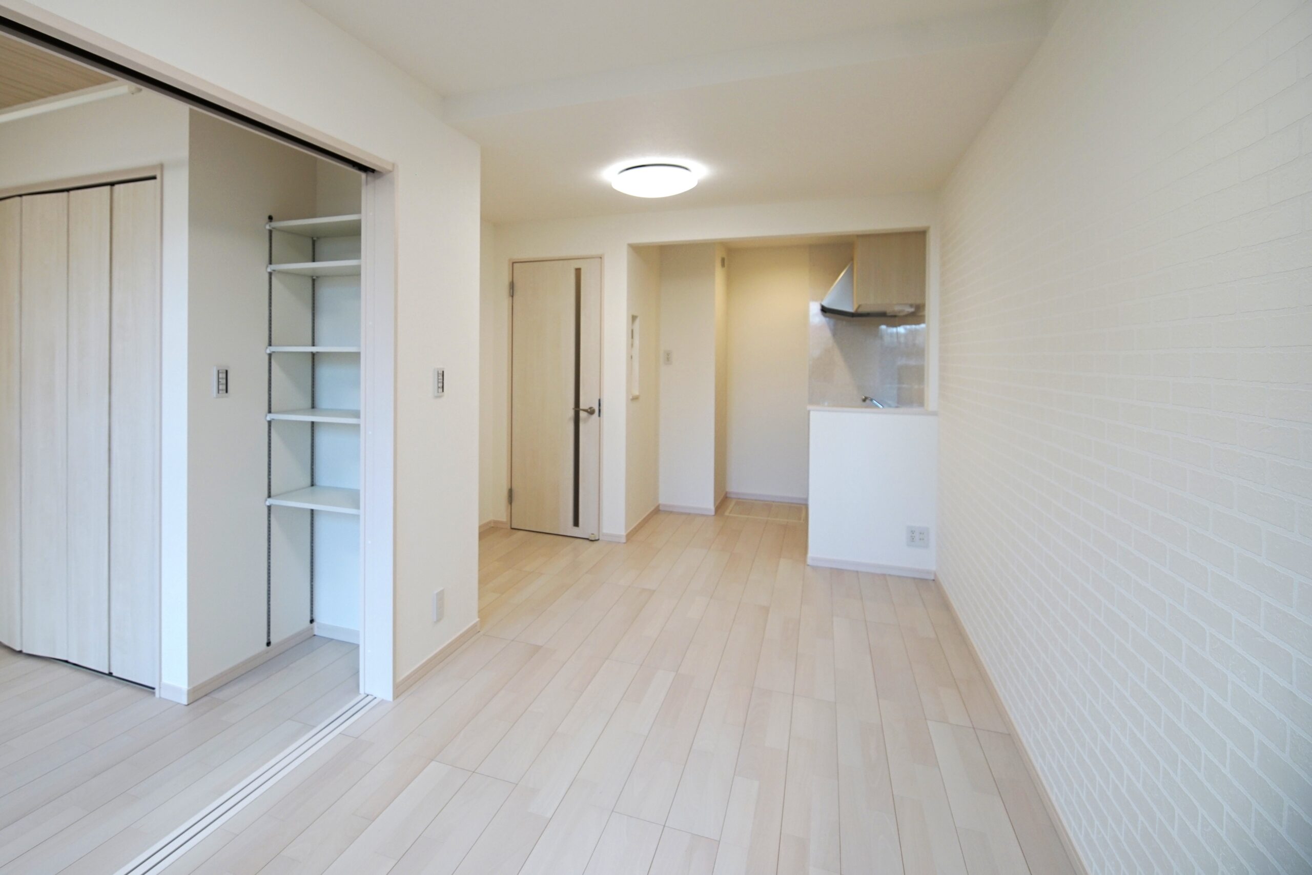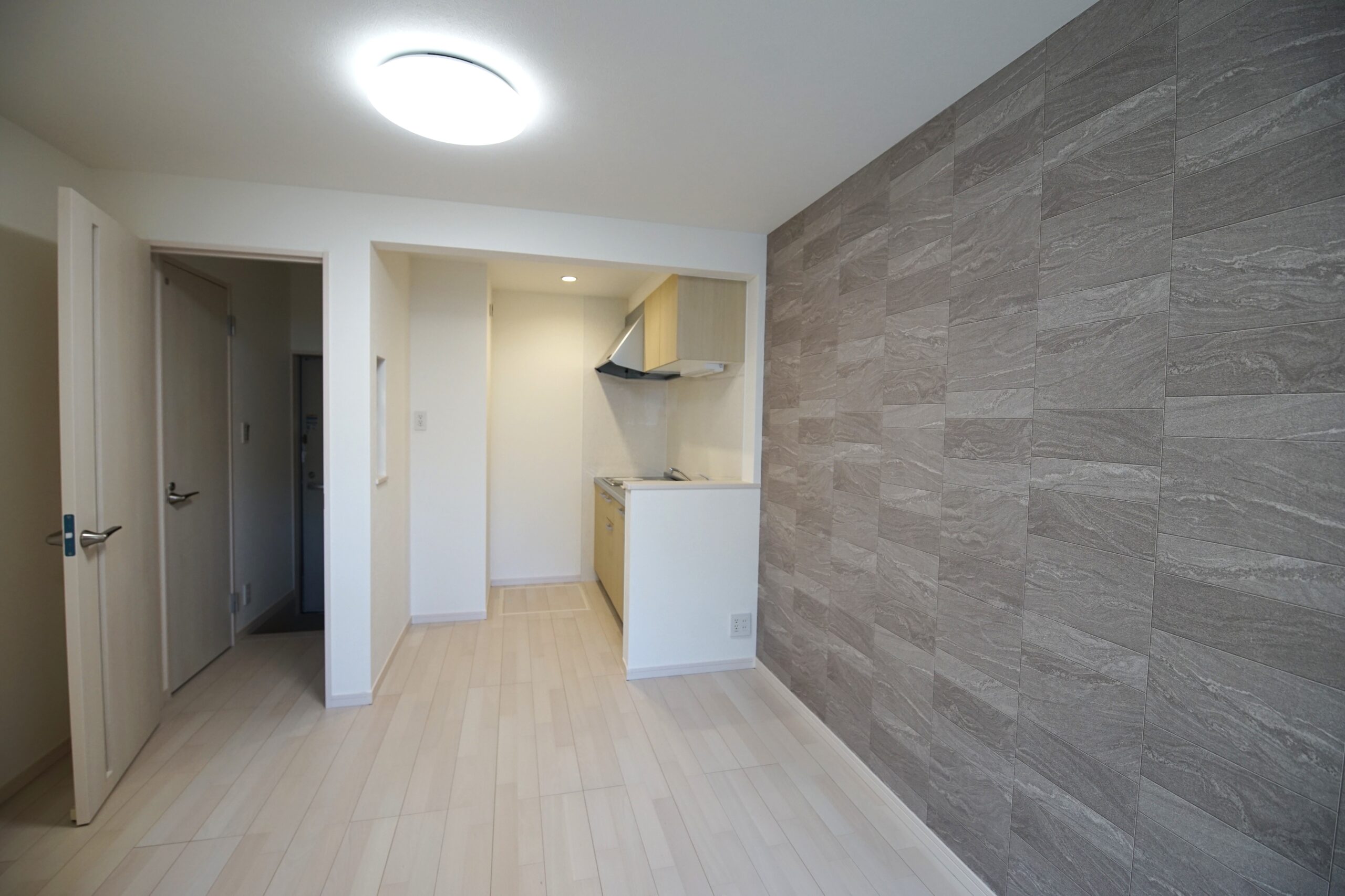 お部屋の壁や床は、清潔感のある白系の色をベースとし、リビングにはアクセントクロスを使用し、号室ごとに異なる柄を使用しています。
